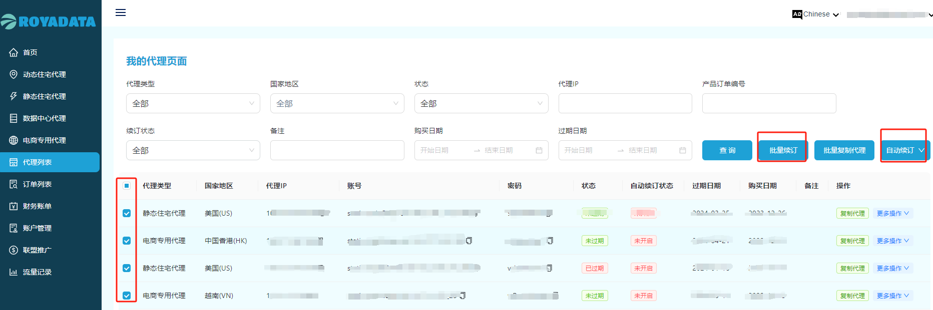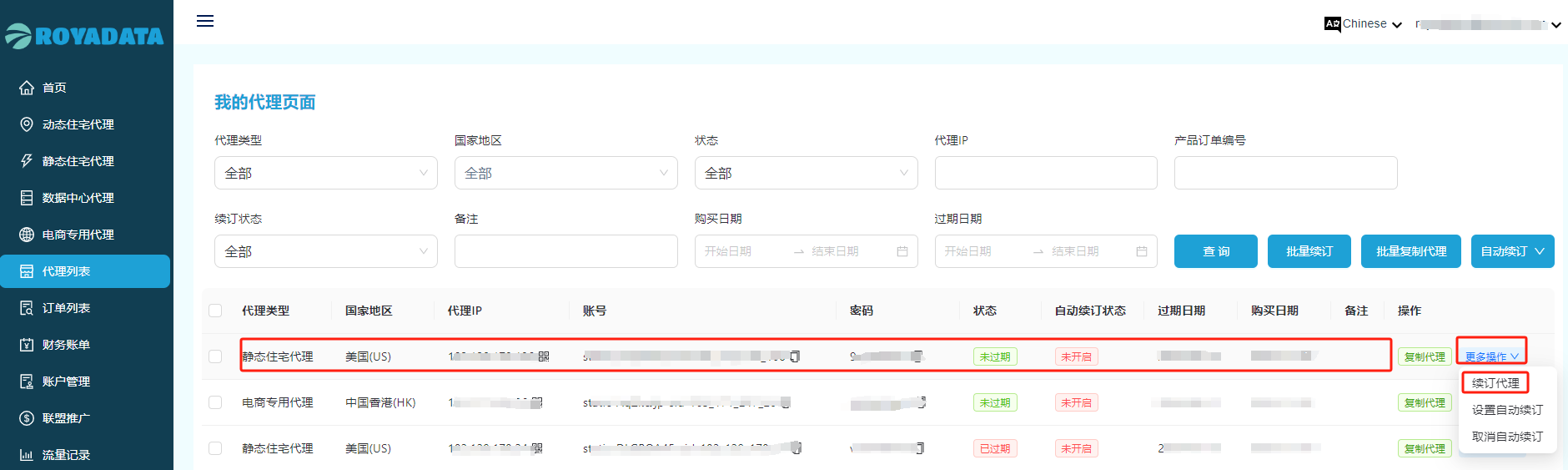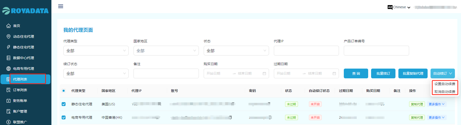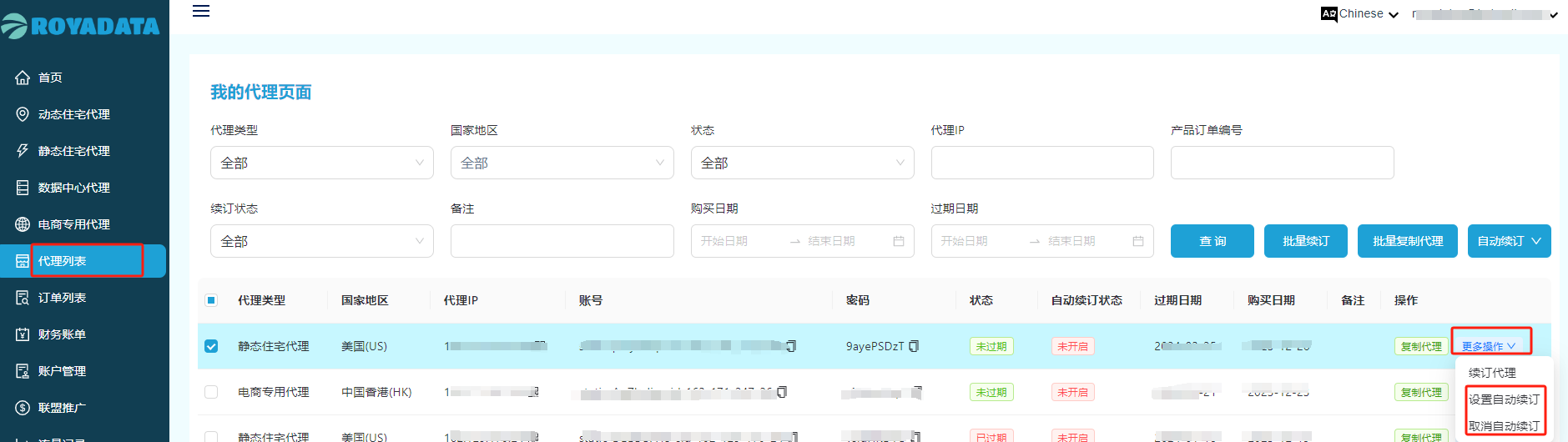 单个静态代理续费,代理列表找到需要续费的代理IP,点击右侧 更多操作 下拉菜单续费代理,或者开通自动续费。 静态代理批量续费,代理列表找到需要续费的代理IP并勾选,点击 批量续费 静态代理开启/关闭自动续费 静态代理批量开启/关闭自动续费