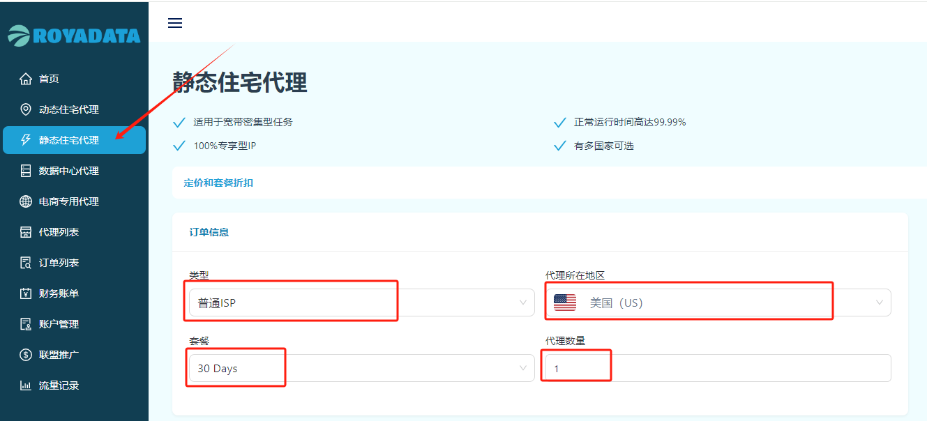 购买静态代理时,按照自己的需要选择代理类型、国家、地区、代理协议、套餐、数量等条件。
