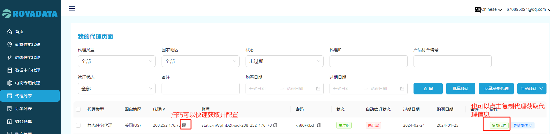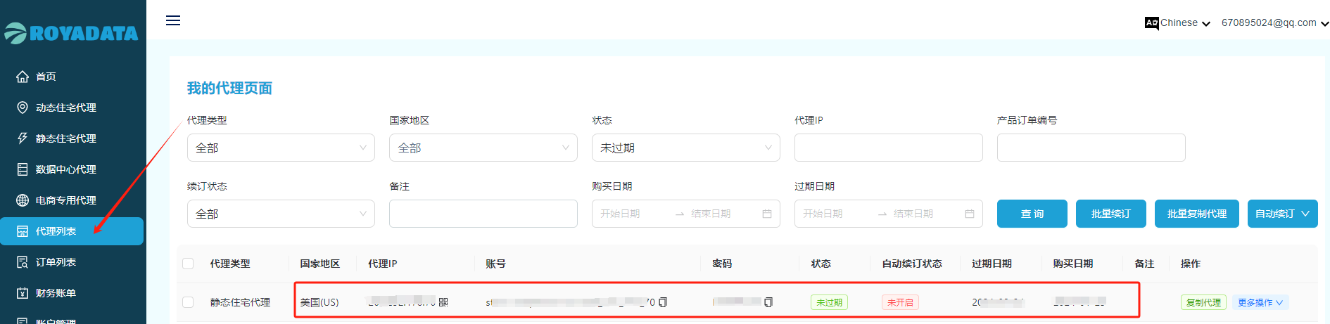 订单完成后会自动刷新代理列表,我们可以清楚的看到代理信息。